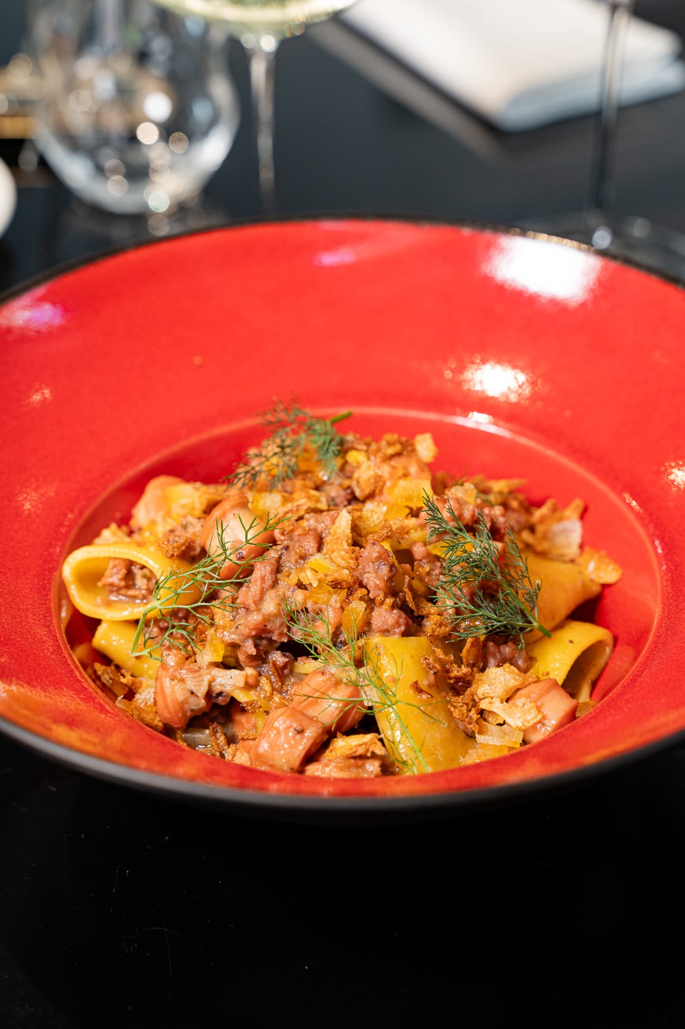 | Pacchero al ragù di polpo, arancia candita, cipolla crispy | (1-3-4-12-14) | 30 € |
