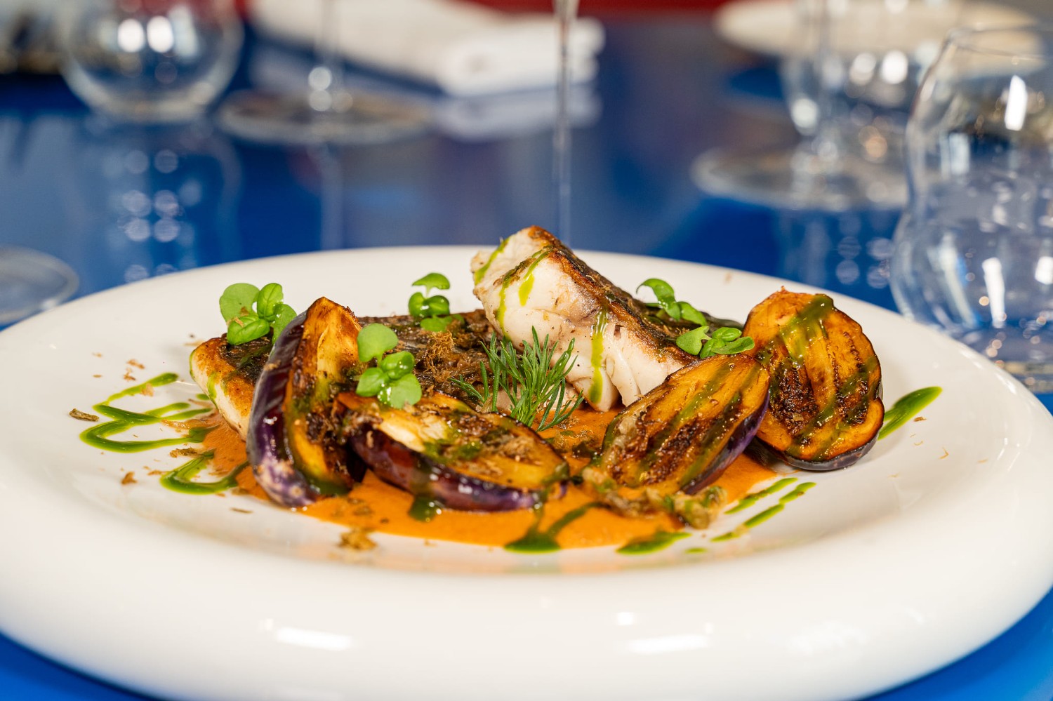 Filetto di ombrina alla parmigiana di melanzana, coulis di basilico, melanzane baby, cappero fritto