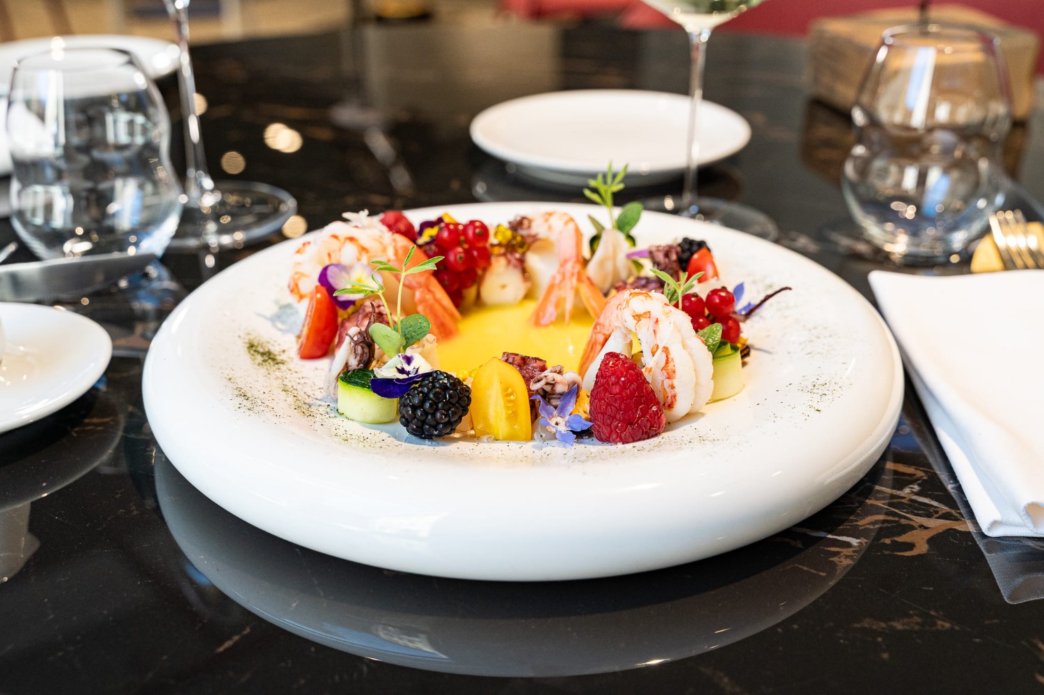 | Rana pescatrice CBT, crema di zucchine gialle e verdi, chips di pancetta, cavolo cappuccio marinato | (4-11) | 34 € |